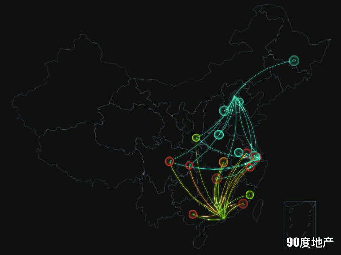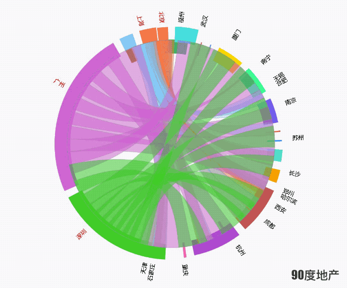 除了反映从北上广深逃离人群整体流向的迁徙图外,还针对北京、上海、广州、深圳四大城市,分别研究了其逃离人群流向城市的分布情况。