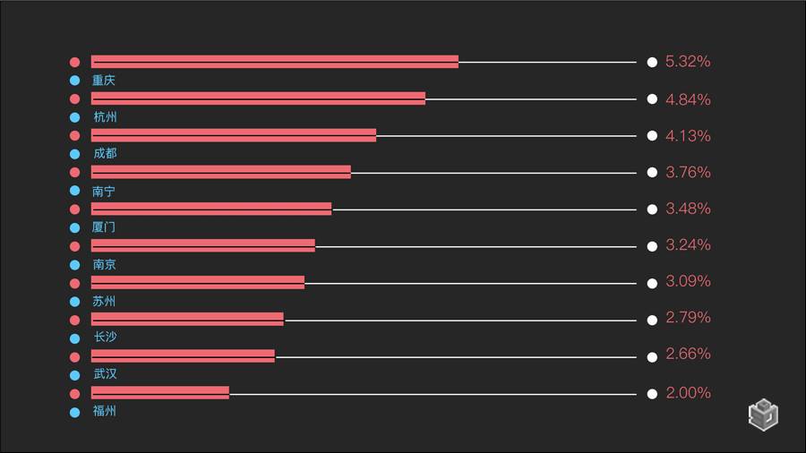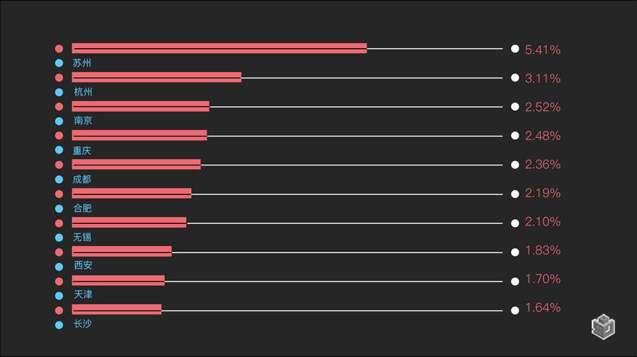 从北上广深人群迁徙图和北上广深人群流入城市TOP10图可看出,逃离一线城市的人群,主要流向了重庆、杭州、成都、厦门、苏州等地。