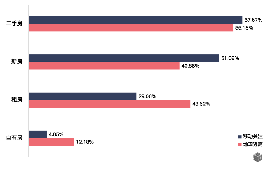 为了更准确地反映逃离人群对居住需求的趋势性,在逃离人群关注行为的基础上(图13标注为地理逃离),我们叠加分析了有逃离意愿人群关注行为的大数据计算结果(图13标注为移动关注)。