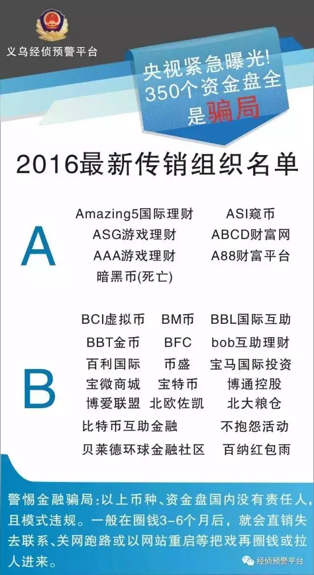 温州书画宝骗局,浙江世尊,炎黄文交所骗局,南京钱宝网理财骗局,号称年收益率72%,胜威国际集团,MMM理财骗局,云世纪SKY理财骗局,御花园理财骗局,马来西亚保绿木拆分盘,中民福祉无忧天使互助平台,金汇泰网络互助,fifa精算投资优选平台,鸿遵付,各种邮票电子盘、原始股骗局。