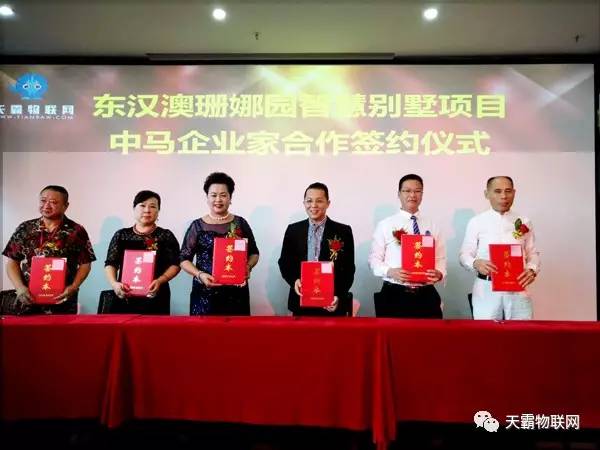 在郑惟生先生详细介绍了马来西亚第二家园“东汉澳珊娜园”的具体情况之后,紧接下来,举行了一个特别隆重的仪式:中马企业家“东汉澳珊娜园”智慧别墅项目正式签约---来自广东惠州的威家宝家具有限公司董事长张文钟(天霸物联网联盟商家)和马来西亚东汉国际房产置业置业股份有限公司董事长、总裁郑惟升正式签署双方合作协议,协议涉及:东汉集团意向性的向威家宝公司采购合计总金额为人民币8-10亿的家具用品,用于配套东汉集团“东汉澳珊娜园”智慧别墅项目。