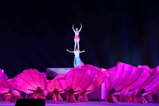 支架下方,数十位穿着粉色扇子衣服的表演者也吸人眼球。衣服别具风味,一把大扇从腰间伸出,高出人头一米多。数十把粉色扇子齐开齐和,如若瓣瓣桃花。