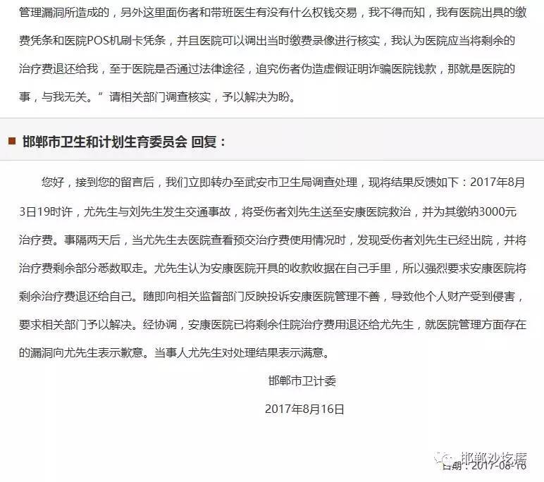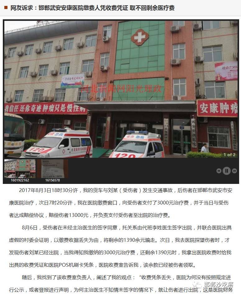 网友诉求:邯郸武安安康医院缴费人凭收费凭证 取不回剩余医疗费