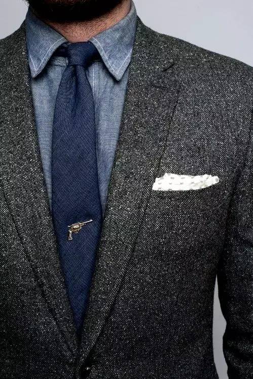 灰色西装也可以配蓝色领带,配以适当的材质,显得非常复古