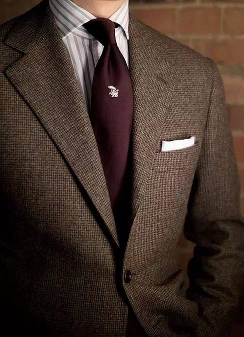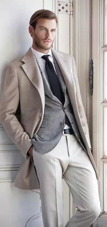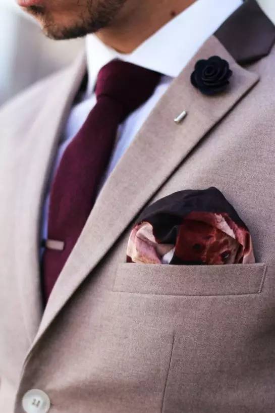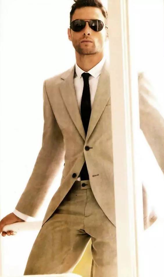 浅驼色西装,可以配酒红、暗褐、灰、等颜色领带,穿白、灰、银色衬衫