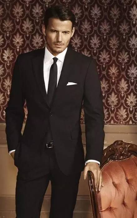 黑色领带可以相似色配色,一身黑;也可以互补色,可以说互补色里面最具有代表性的就是黑白配了,非常SHARP。