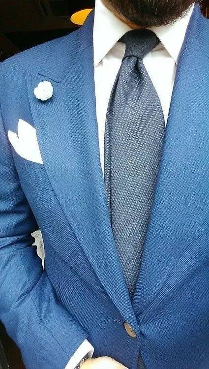 蓝色西装,可以配蓝、胭脂红和橙黄色领带,穿白色和亮蓝色的衬衫