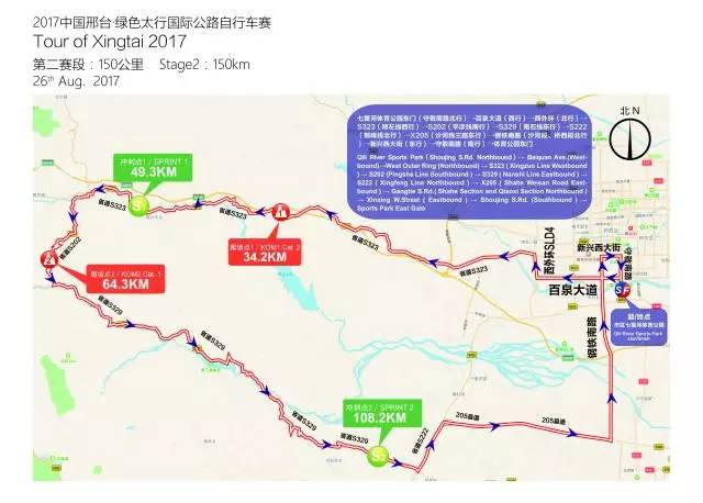 路线:七里河体育公园东门(守敬南路北行)→百泉大道(西行)→西外环(北行)→s323(邢左线西行)→s202(平涉线南行)→s329(南石线东行)→s222(邢峰线北行)→X205(沙河纬三路东行)→钢铁南路(沙河段、桥西段北行)→新兴西大街(东行)→守敬南路(南行)→七里河体育公园东门(赛事终点)