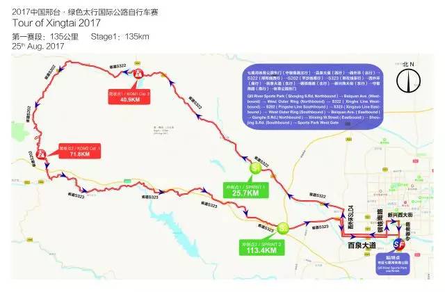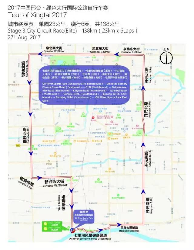 路线:七里河体育公园东门(守敬南路北行)→百泉大道(西行)→西外环(北行)→s322(邢和线西行)→s202(平涉线南行)→s323(邢左线东行)→西外环(南行)→百泉大道(东行)→钢铁南路(北行)→新兴西大街(东行)→守敬南路(南行)→七里河体育公园东门(赛事终点)。