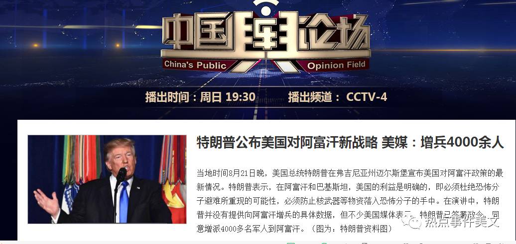我们先看一则新闻:8月21日,特朗普公布美国对阿富汗新战略,增兵4000余人。而央视新闻网将在8月27日,也就是周日中央四台《中国舆论场》进行详细分析。