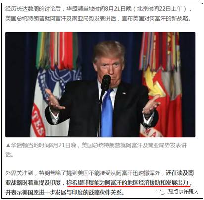 8月22日,特朗普除了提到美国不能接受从阿富汗迅速撤军外,还在谈及南亚战略时着重提及印度,称希望印度能为阿富汗的地区经济援助和发展出力,并表示美国愿进一步发展与印度的战略伙伴关系。