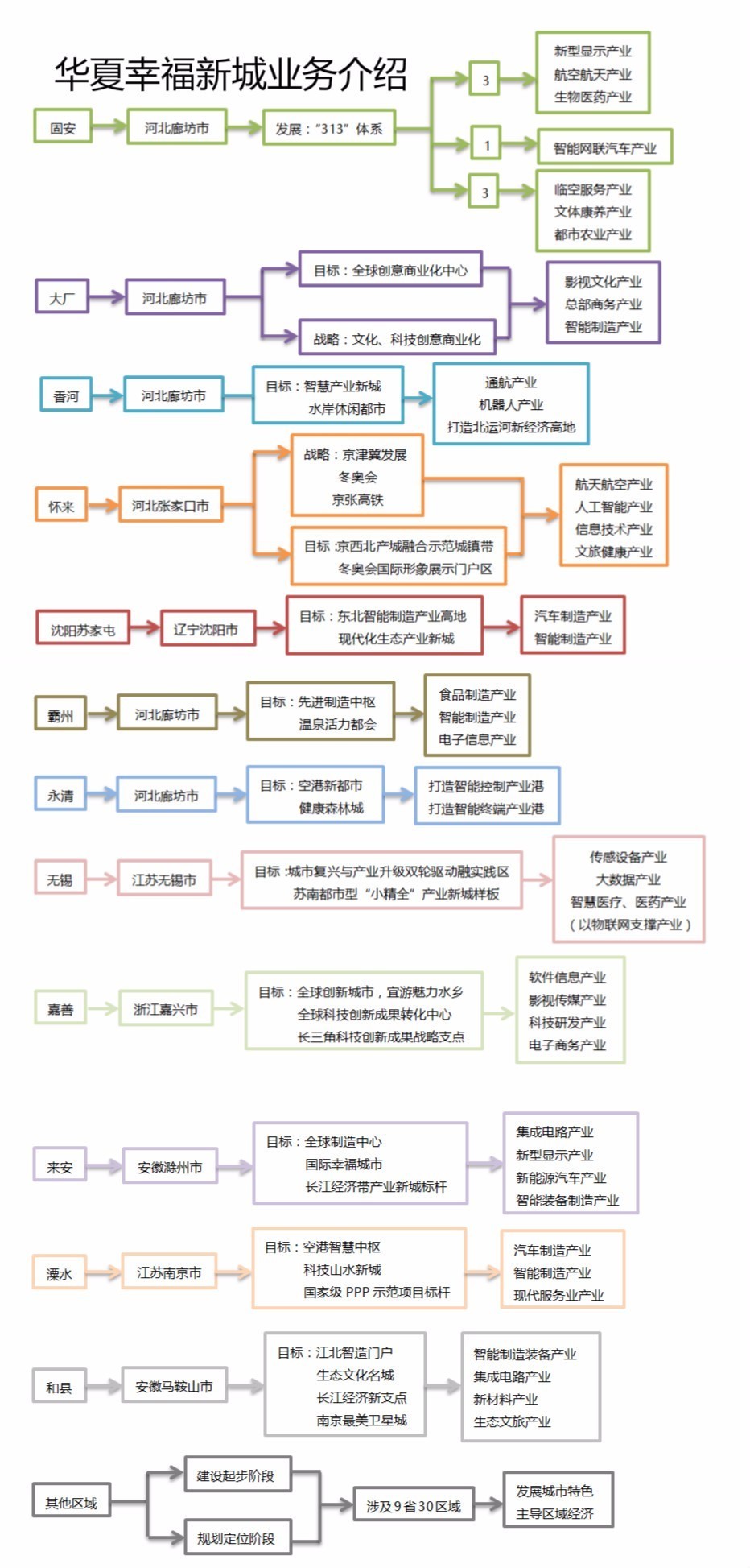 自固安产业新城以来,华夏幸福在京津冀、珠三角、中原城市群、成渝城市群即长江中游城市群等地区布局产业新城,重点扶持产业涵盖电子信息、高端装备、新能源汽车、航空航天、节能环保、新材料、生物医药、都市消费、生产性服务业、文化创意等十大行业。