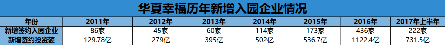 正因为如此,华夏幸福新增签约入园的企业和新增签约投资额每年都大幅增加。2012年,华夏幸福新增签约入园企业45家,新增签约投资额仅279亿。仅2017年上半年,新增签约企业和新增签约投资额就已经分别达到222家和731.5亿。