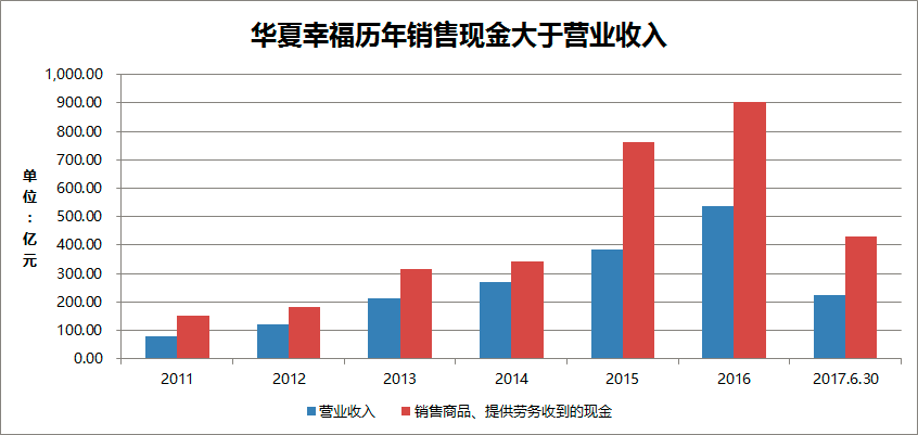 2011年至2016年,华夏幸福预收账款就一直稳步增长。2017年上半年,华夏幸福预收款项余额月1,330.6亿元,较期初增长29.8%。