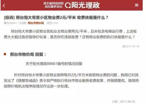 首先关于邢台恒大帝景收取高额物业费一事,官方最先有了说法