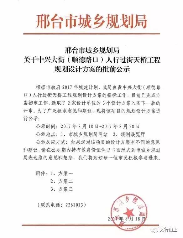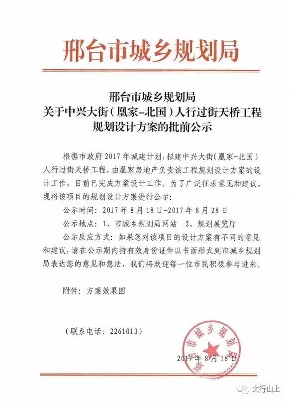 近日,邢台市城乡规划局公布了关于中兴西大街(凰家—北国)和中兴东大街(顺德路口)两座人行过街天桥的工程规划设计方案的批前公示。(如下图)