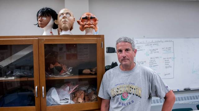 △ Dr.Marzluff 和他的三个面具,最右边的是野人面具。(图片来源:https://www.hbmpodcast.com/podcast/hbm038-do-crows-mourn-their-dead)