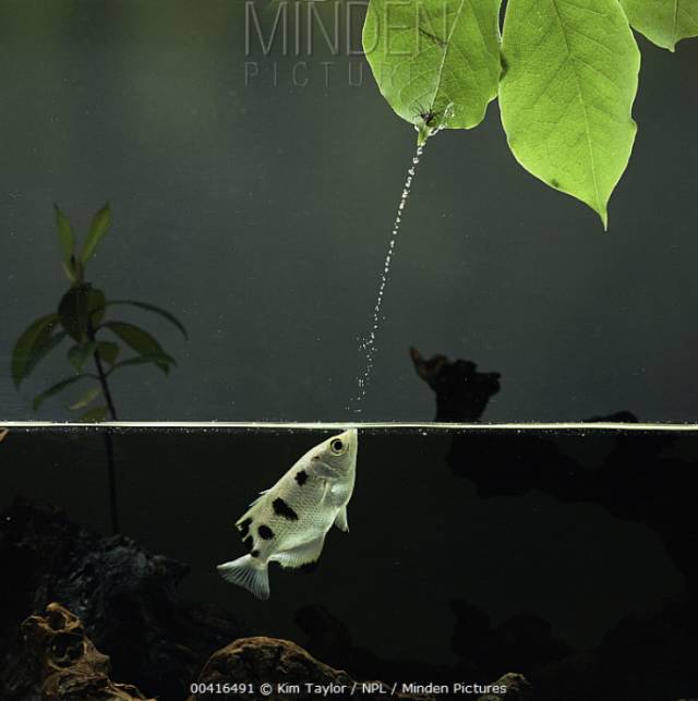 当你去水族馆的时候有没有想过你所看到的鱼其实也能够认得你的脸?这是我要讲的第二个有趣的例子。最近一个英国和澳大利亚的研究发现了射水鱼也能够学习和分辨人脸。射水鱼是一种热带的淡水鱼,它们的名字来源于它们的一种特殊的技能:它们可以从口腔喷出水柱以捕食在水面上的停驻在植物上的昆虫。