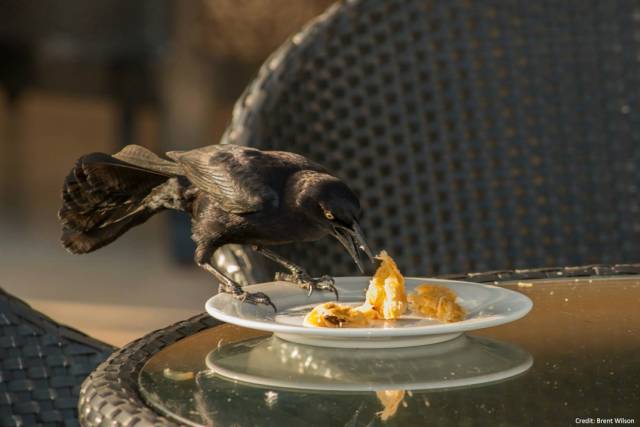 △ 牙买加黑鹂在吃盘子里的剩的食物。如果是乌鸦的话记得别硬钢。(图片来源:Brent Wilson)