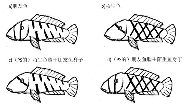 在让它们熟悉了对方七天之后,研究人员把这对鱼分开,然后给每条鱼放了4个鱼的录像。第一和第二个录像分别是跟它住了七天的“朋友鱼”和它没见过的“陌生鱼”。 第三和第四个录像是PS出来的两条鱼,分别是:朋友鱼脸+陌生鱼身子和陌生的鱼的脸+朋友的身子。