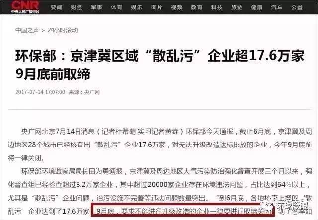 环保部近日通报,要将从严治理“散乱污”企业作为强化督查的重点内容之一,对无法升级改造达标排放的企业,今年9月底前一律关闭!截止6月底,京津冀及周边地区28个城市已经核查出“散乱污”企业17.6万家!