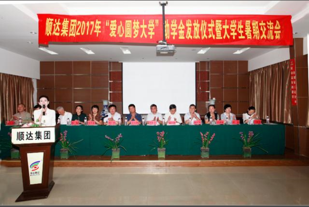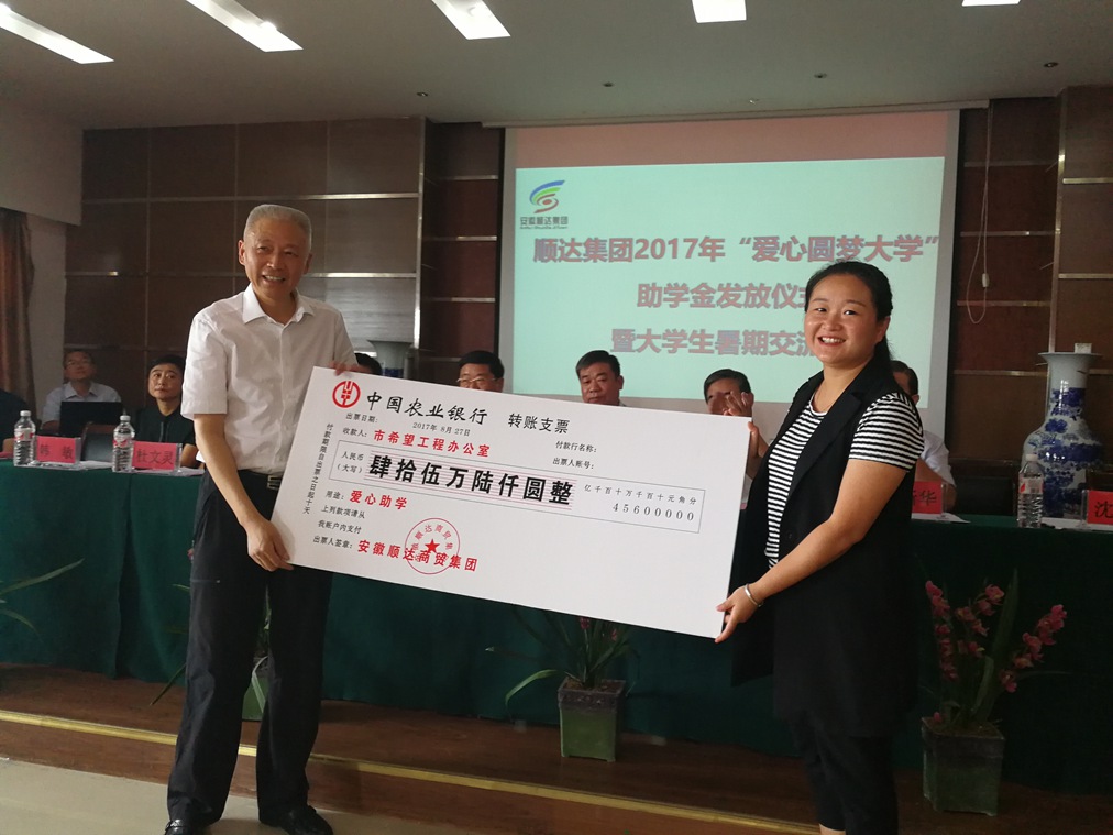 安徽讯(记者范为民 程声响 通讯员赵勇)8月27上午,安徽顺达集团2017年度大学生助学金发放仪式暨暑期交流会在濉溪县安徽顺达集团五楼会议室举行。淮北市人大常委会党组书记、常务副主任方宗泽,淮北市委常委、濉溪县委书记李加玉,淮北市副市长胡百平,淮北市政协副主席李彦秋,淮北市人大常委会原副主任、市慈善协会会长杜文灵,淮北市教育局局长陈新华,淮北市委统战部副部长、市工商联党组书记韩敏,共青团淮北市委副书记沈慧星, 濉溪县副县长、县工商联主席任婷,濉溪县教育局局长单春晓,共青团濉溪县委书记丁晓莉,淮北市慈善协会秘书长贺红军,淮北市工商联主席、总商会会长、安徽顺达集团董事长姚勇,受资助大学生及家长近200人参加活动。