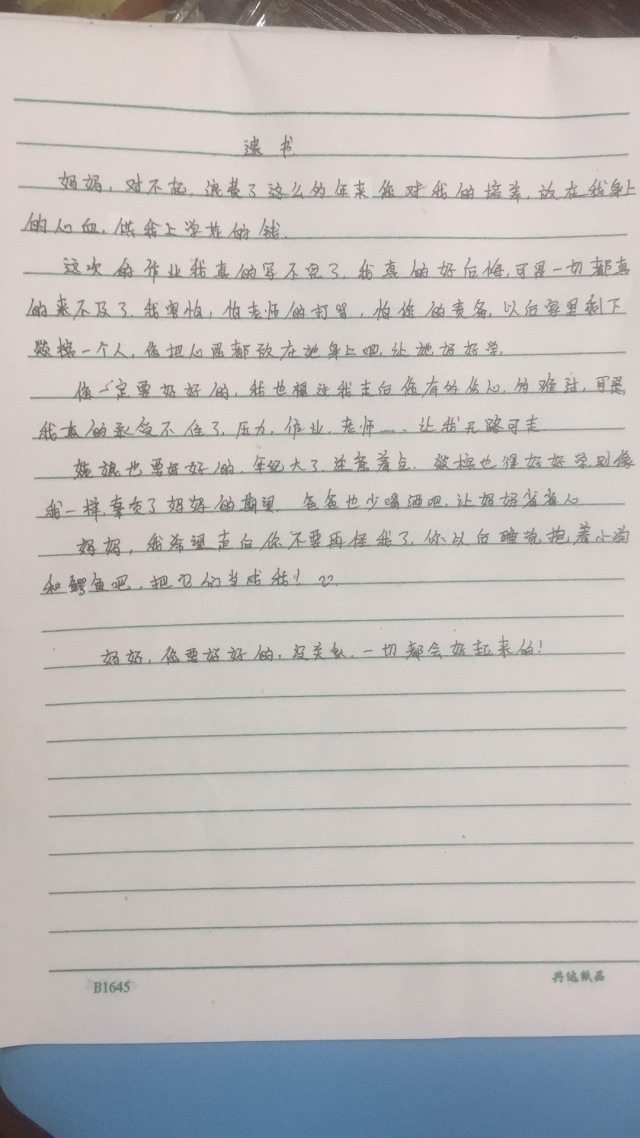您一定要好好的,我也想过我走后您有多伤心,多难过,可是,我真的承受不住了,压力,作业,老师,,,让我无路可走