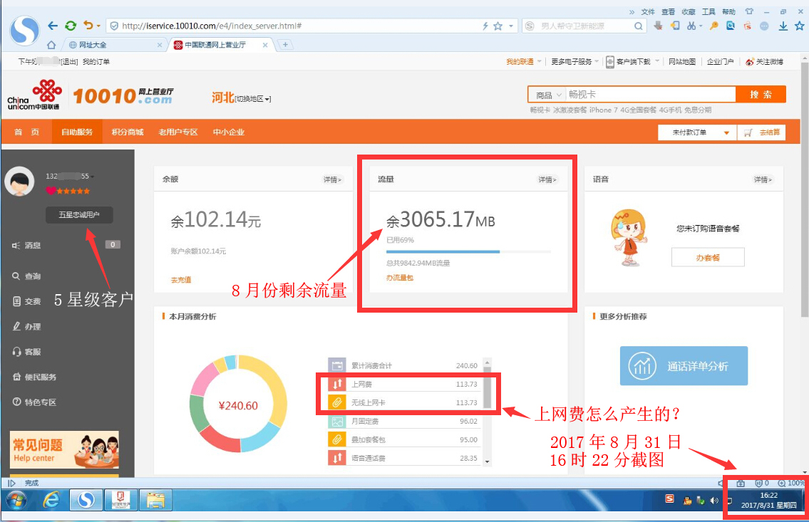 8月31日,张先生登陆联通网上营业厅查询自己的手机账户信息时惊奇地发现,张先生的手机账户上显示剩余流量还有3065.17MB,然而在消费分析一栏显示,张先生8月份产生的手机上网费用是113.73元,既然手机还有这么多流量为什么29日却被欠费停机?并且莫名其妙的产生了一笔上网费。对此张先生是一头雾水,随即再次拨打联通客服电话10010进行咨询,客服人员答复称将会在48小时之内给予回复。