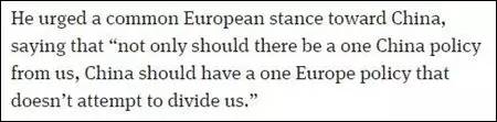他说:“不能只是要求我们坚持一个中国原则;中国也应当坚持一个欧洲的立场,不能试图分裂我们。”