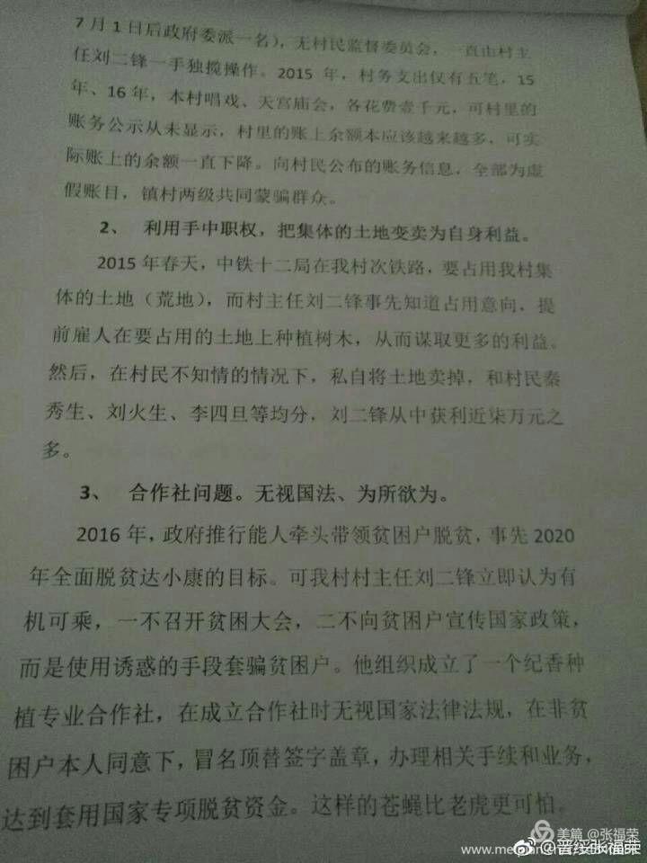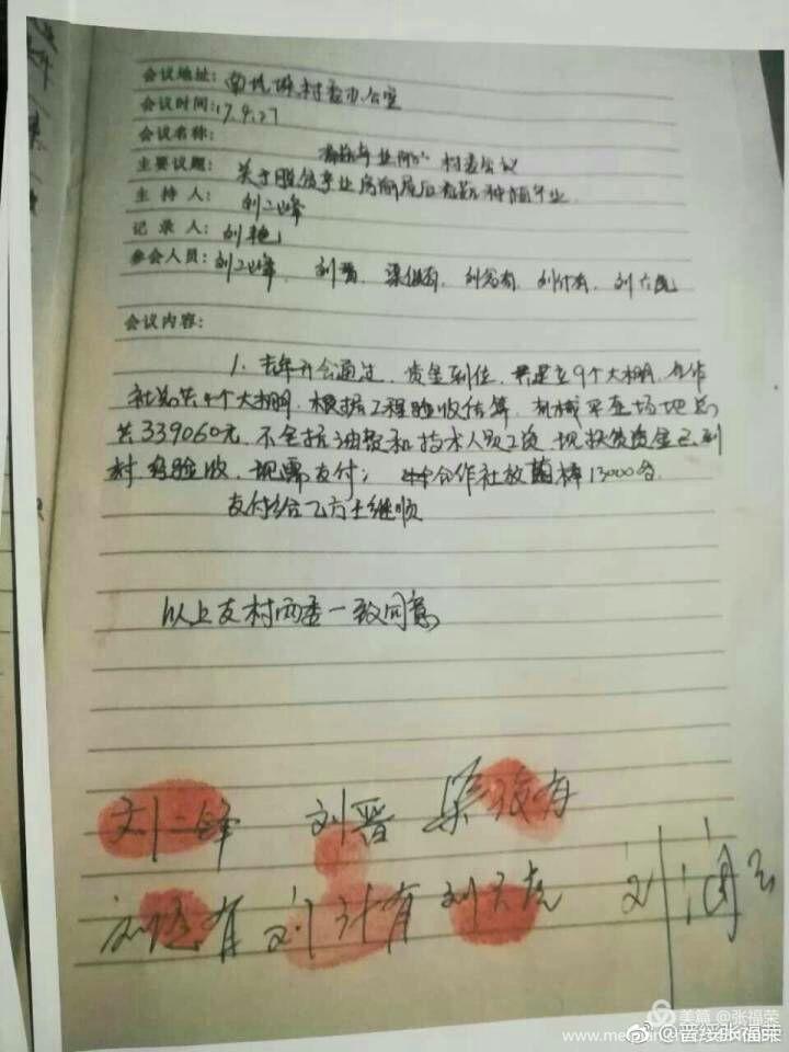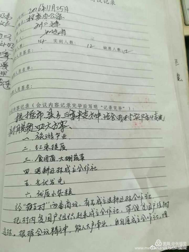 造林合作社社借“道”村财务敛财2016年,村里引进扶贫项目——临县广林扶贫攻坚植树造林专业合作社。临县广林扶贫攻坚植树造林专业合作社筹备期间,刘二峰组织召开了村两委会议。会上明确植树造林专业合作社以村集体名义成立,刘二峰为法人,支村两委班子成员为合作社能人大户,然后吸收贫困户入社,通过合作社和能人大户带动贫困户脱贫,当时有会议记录。但是,在之后的具体操作中,刘二峰私改会议记录,将“二”字改为“海”字,采用瞒天过海的方式把法人改为他的亲信刘海峰,而且将合作社完全变成了个人性质。现在,这个合作社的运营与以支村两委成员组成的为社员(能人大户)毫无关系。合作社成立后,在刘二峰的操作下,村集体财务转给合作社30万元现金。很明显,这是侵占集体资金。针对异议,刘二峰的解释是:“钱是通过关系在上面给合作社争取的,因为程序问题,这笔钱不能直接打到合作社,只好先打到村委会的账上,通过村委会再将钱打到合作社了。”这个借“道”乌龙也有会议记录。