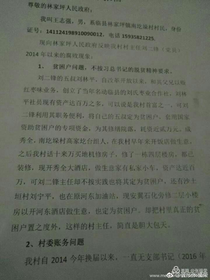 资产超百万的贫困户南圪垛村由沙垣、高家圪台、南圪垛三个自然村组成,村里原有贫困户192户,2016年脱贫15户,现有贫困户177户。原本这177户贫困户是经过支村两委会议研究确定的,但是刘二峰为了培植自己的亲信,私自把一些与他不对眼的贫困户剔除,然后把他的亲信添加进去。令人啼笑皆非的是,刘二峰的五叔刘林平早在数年前就创办了临县刘氏枣业合作社(2016年,刘氏枣业合作社法人变更到刘二峰堂兄刘建军名下),刘林平个人资产在百万之外,然而,刘二峰竟然利用职务便利,将刘林平定为贫困户,套用国家资助贫困户的专用资金为其修缮宅院,花费近2万元;村民成某全在村里有一栋四层楼房,开着大酒店,拥有私家车,资产近百万,也被刘二峰定为贫困户;村民刘某平有一栋小二楼,在这栋小二楼上开的饭店,也被刘二峰定为贫困户。而村里很多实实在在没有经济收入、生活困难的家庭,却被置之度外。