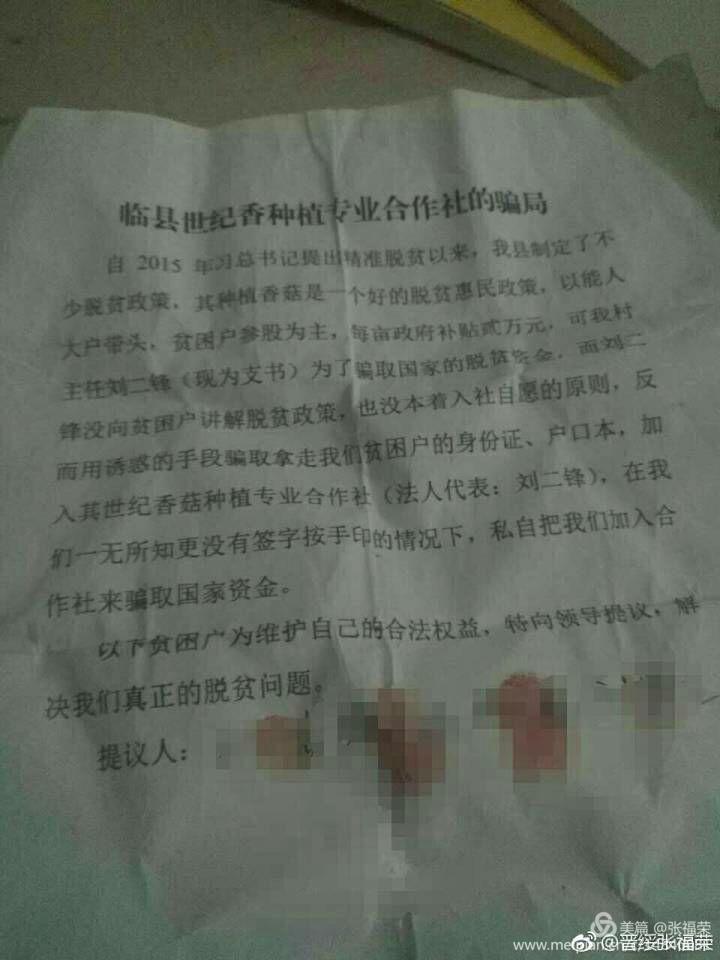 香姑合作社套取扶贫资金扶贫扶谁?2016年,南圪垛村委会借助房前屋后大企业加小礼包的扶贫政策,组织成立临县世纪香菇种植合作社,刘二峰为合作社法人。香菇种植合作社项目的推进过程中,刘二峰搞一言堂,没经过村民代表大会和四议两公开程序,只在村两委会议上进行了形式性的宣布,村委会总共花费33万元建了10个香菇大棚,购入菌棒。但是,这笔投资经费没有明细账目,购入的菌棒为其它地方淘汰下来的废品,只出了一茬锅。而且,村委会出账33万元不知给了谁。香菇种植合作社本来是一个扶贫惠民的好项目,宗旨是通过能人大户带头、贫困户参股、政府补贴的方式,达到帮助贫困户脱贫摘帽的目的。临县世纪香菇种植合作社利用虚假材料,以政府每亩补贴2万元的标准,获得政府补贴60万元扶贫资金。按照国家扶贫政策的相关要求,每户贫困户以5000元扶贫专用资金作为加入合作社的股金,60万扶贫资金需要有120户贫困户入股,每户每年分红400元。刘二峰为了骗取国家的脱贫资金,没向贫困户说明脱贫政策,只是通过村委会广播,通知贫困户将身份证、户口本交到村委会,通过骗取贫困户身份证、户口本等手段,在贫困户毫不知情、更没有签字摁手印的情况下,私自将120户贫困户加入临县世纪香菇种植合作社,从而达到其套取国家扶贫资金的目的。