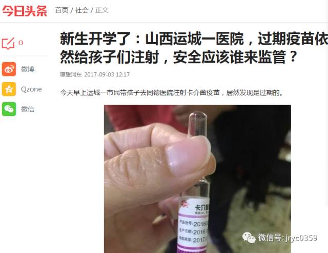 核心提示:网曝9月3日早上,运城一市民带孩子去同德医院注射卡介菌疫苗,发现是过期的。过期疫苗的危害大家可想而知,希望主管部门迅速介入