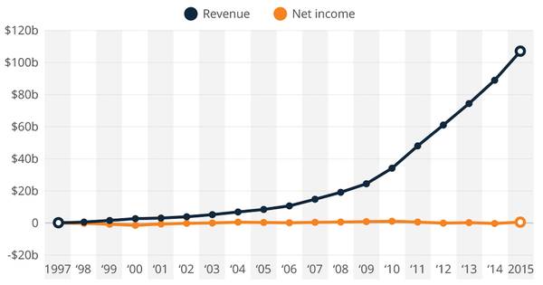 纵观1997年以来亚马逊的财务报表,可以发现它在过去20年中,营收实现指数级增长,但净利润几乎为零。这就带来另一个问题,为什么一个绝大部分年份都在赔钱的公司,能成为世界第二大互联网公司?