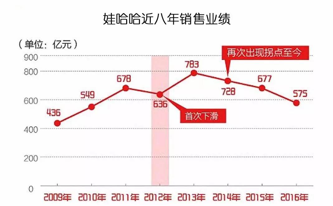 比如宗庆后,30多年前创立娃哈哈,在90年代依靠广告营销和强大渠道能力,企业一时风光无限。而近几年随着饮料业寒冬加剧,以及对市场不敏感,已逐渐陷入业绩下滑的深渊。数据显示,娃哈哈2009年营收为436亿,同比增长32.93%;2010年实现营业收入549亿元,同比增长25.91%;2011年实现营业收入678亿元,同比增长23.65%;而娃哈哈2012年实现的营业收入仅为636亿元,同比下滑了5%。2013年,娃哈哈完成783亿元营收;2014年又下降为728亿元;2015年下滑至677亿,2016年继续下降至575亿。相比于巅峰时期,其营收几乎腰斩。