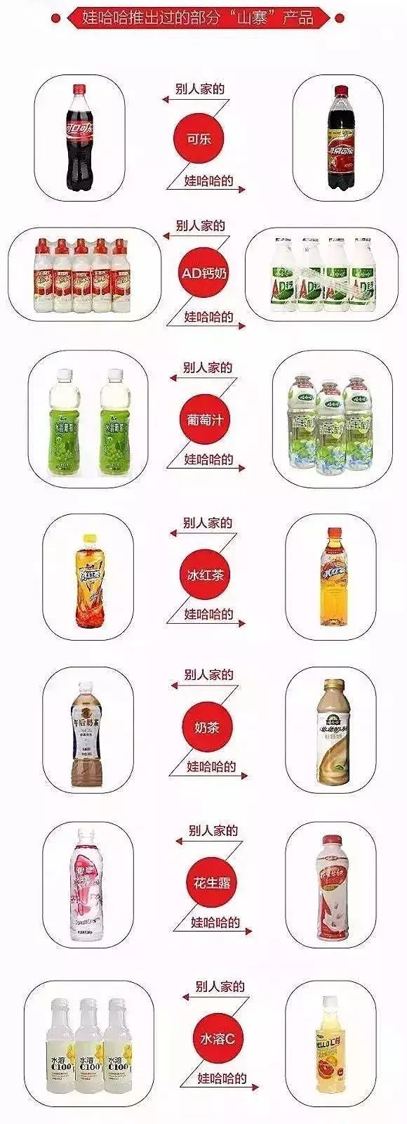 其实娃哈哈的新品开发从未停止,推出过的产品多达300种。其中大部分的营销推广方式几乎一致,找一个市场上已经成功的饮料,然后低成本迅速山寨一款产品,借助强大的经销商渠道投放至终端,同时加上大规模广告轰炸,业内给了娃哈哈一个“饮料界腾讯”的称号。中国饮料业在90年代初野蛮增长,低成本快速山寨策略为娃哈哈带来巨大销量。1987年娃哈哈的儿童营养液,对标广州太阳神,只用两年时间销量接近1亿,1991年娃哈哈果奶也仅用一年时间销售额到达1亿,该产品1996年升级为AD钙奶,无论是销量还是知名度都有进一步上升。2005年娃哈哈模仿小洋人妙恋,推出营养快线饮料,在高峰期年销售额达到200亿,一举成为支柱产品,这一纪录连续保持12年,1998年推出的非常可乐迅速打开农村市场可乐的空白,高峰时期也为娃哈哈贡献20亿销售额。
