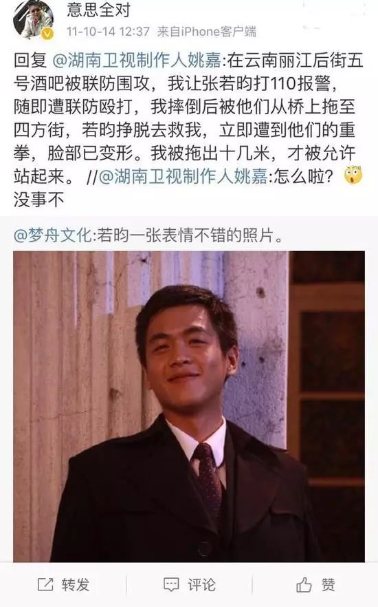 2011年10月,演员张若昀和其父张健就曾在丽江被打,张健当时发微博写道:“在云南丽江后街五号酒吧被联防围攻,我让张若昀打110报警,随即遭联防殴打,我摔倒后被他们从桥上拖至四方街,若昀挣脱去救我,立即遭到他们的重拳,脸部已变形。我被拖出十几米,才被允许站起来。”