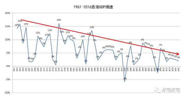 纵观香港1961-2016年,这几十年的GDP增速,这艘巨轮从当年总则接近20%的年增速,如今跌落在2%-3%左右徘徊。