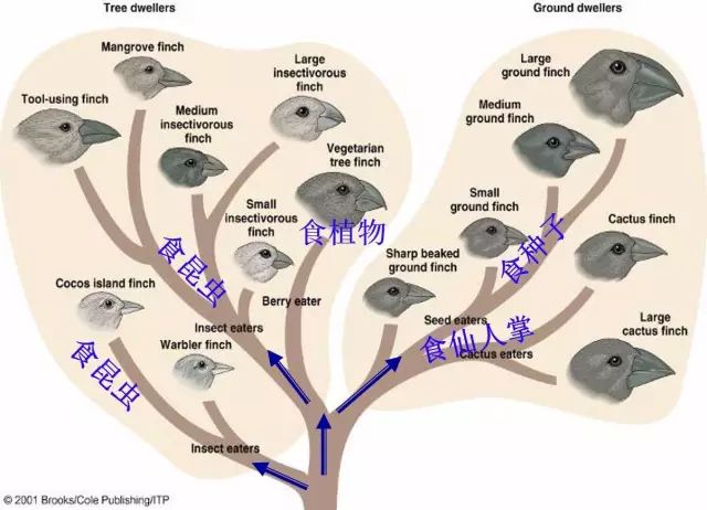 现在我们很清楚了。由于这种雀在各个岛上彼此分离,沿着不同的路线演化。即使在同一个岛上,由于食物很少,原来吃一种食物的鸟现在变成吃树上的虫子,虫子不够吃了在地上吃种子,都吃不到就去吃仙人掌。久而久之它们的喙部就发生了分歧,各自沿着不同的路径往前发展,然后就形成了不同的物种。