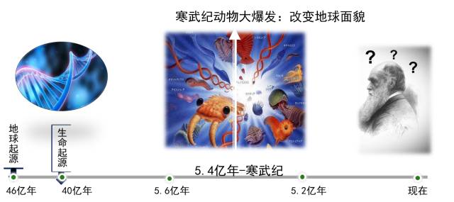 在这里我想解释一下什么是寒武纪大爆发。在地球46亿年的历史里面,前面三十几亿年都是演化得非常慢。要么没有生命,要么就都是一些单细胞生命,单细胞生命又不好保留化石。