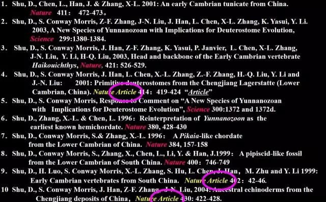 我给大家举出十条,大家能看到,第一作者都叫舒德干,通讯作者也是舒德干。还有三篇叫article。Nature的论文是分级的。我们知道《自然》和《科学》这两个杂志洛阳纸贵,它发表文章最长的是五页,大部分是中短,90%是两页半,短的是一页,绝大部分是中短文章。我们有3篇长文以article的形式发表的。