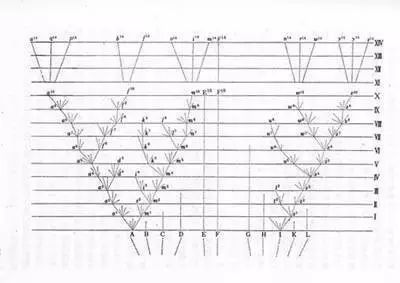 所以达尔文环球航行回来的第二年,他就开始探索物种是不是可变的,并且画了这么一个图。