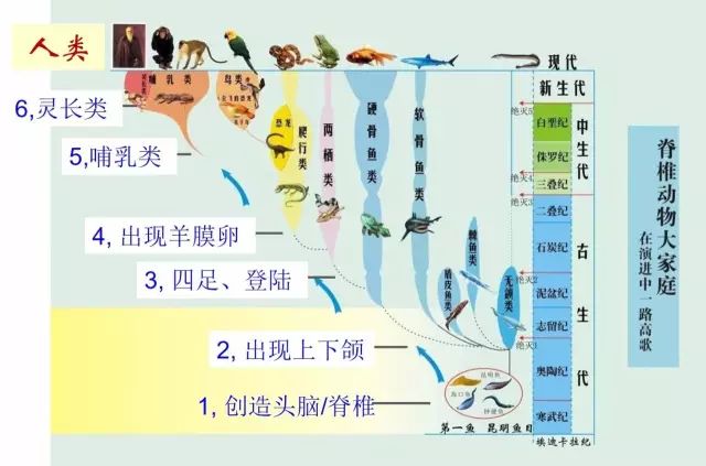 我们再看看这个第一鱼在整个脊椎动物谱系里面是这样的,它在最底下。如果它不存在了,后面都没戏了,当然我们人就不可能出现了,有了它所以才有后面的故事。