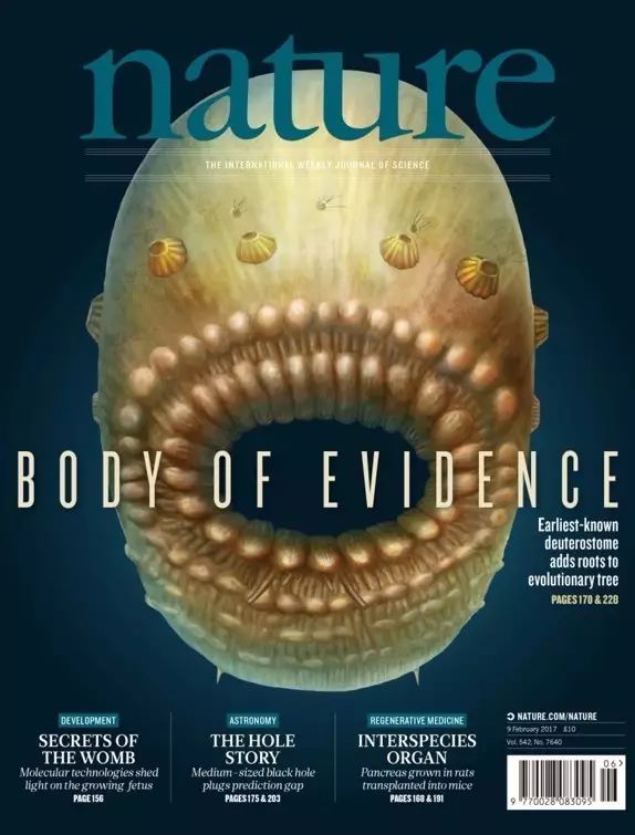 很高兴地告诉大家,大年初三,就是2017年的1月31号,也在Nature上发表了,而且是个封面文章。这个封面上画的就是它,看着画得很大,实际是一毫米。别看它一毫米,它的口这么大。