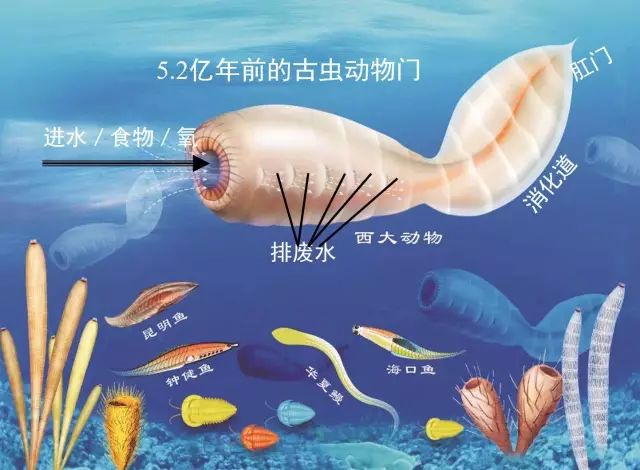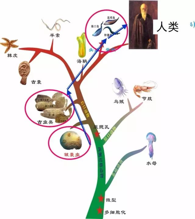 就是这样的一个途径,从这个微小的动物,我们把它叫皱囊虫,然后经过古虫动物类似的有鳃裂的东西,它有肛门了,然后就长出头来了,最后才诞生了人类,整个故事就完整了。