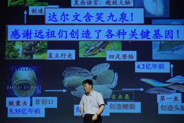 出现后在国际上火得一塌糊涂。BBC的标题就是科学家发现了人类最古老的祖先。美国的《纽约时报》说有大口的人类祖先出现了。国外都是一片叫好声。当然我想这个研究还是一个初步的,是阶段性的。我最后总结一下,我们人类从动物开始出现之后,沿着达尔文的那个路,是由低等动物来的。最低等的动物,在五亿多年前,有这样一些精彩的故事。再接下来到了四亿多年,到了三亿两亿一亿多年,最后就产生了人。大部分的故事我都没有讲,我们只是做了下面的工作,这几个创造都是中国人做出来的。