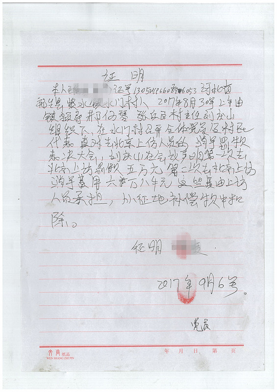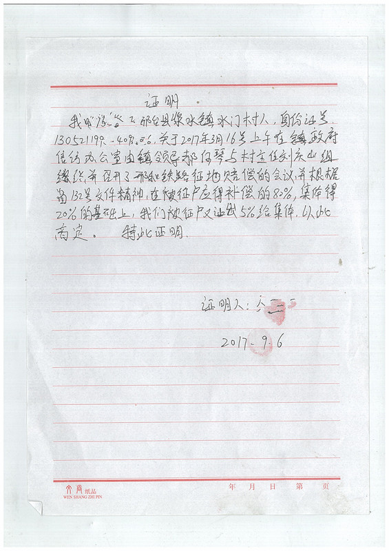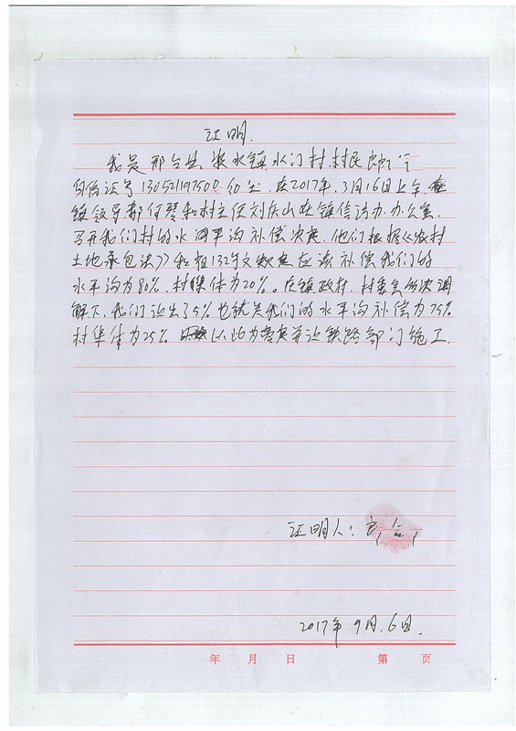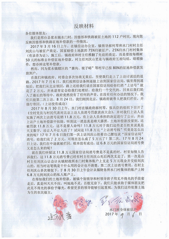近期,接到河北邢台县浆水镇水门村群众反应称,通过预留的联系方式,我们联系到了当地的群众,因修邢和铁路被征用112户农民土地补偿款,引起群众强烈不满,村主任及一些别有用心的人士就在这方面动起了歪脑筋,村民一直对此颇有微词。该村群众给笔者提供了一份当地村民写的一封联名举报信及村民签字画押,