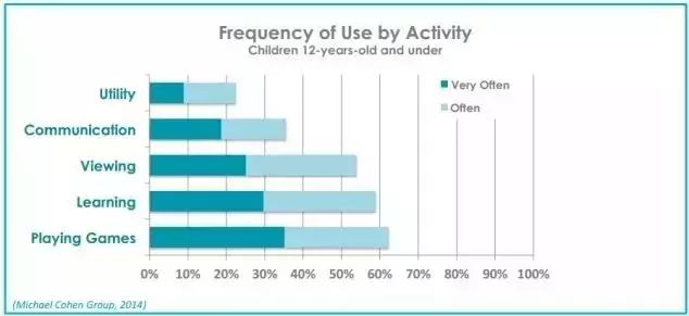 调查还发现,在经常使用触屏的孩子中,最大的使用用途是“玩游戏”,比例同样超过60%。“学习”、“看视频”、“交流沟通”等用途分列二至四位。