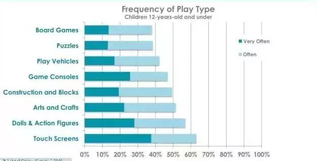 相比之下,常玩棋类游戏和填字游戏的孩子比例不到40%,爱玩模型汽车、做小手工甚至装扮芭比娃娃的小孩子在数量上也不及常玩iPad等电子玩具的孩子。