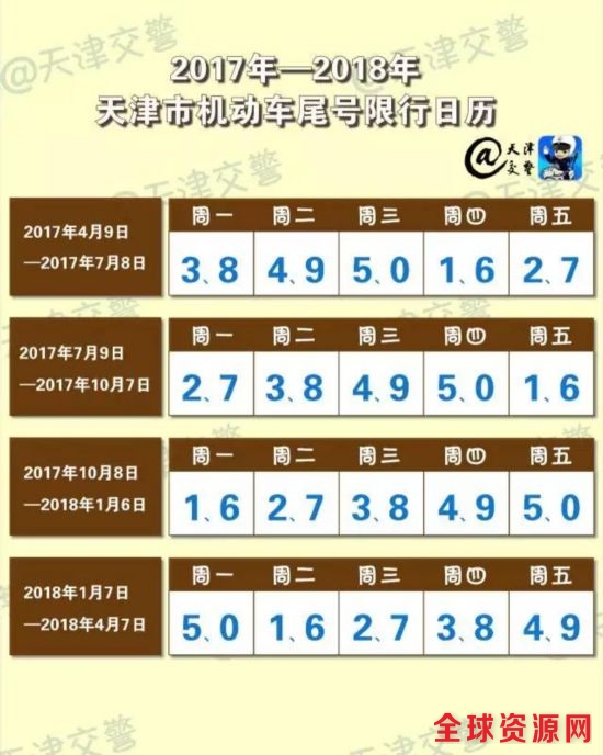 自2017年10月8日至2018年1月6日,星期一至星期五限行机动车号牌尾号分别为1和6、2和7、3和8、4和9、5和0;
